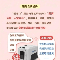 “爱宠单独行”主要针对购票旅客以外的客户,客户可于托运日前2至5天,通过“中铁快运”微信小程序预约并提交宠物相关信息及照片,每名客户单趟列车最多可托运1只符合规定的宠物。预约成功后,旅客或客户需按约定时间携带宠物、有效身份证件、有效期内的《动物检疫合格证明》,前往出发高铁站的中铁快运营业部办理托运手续。抵达目的地车站后,可根据中铁快运短信提示领取宠物。 “爱宠行”服务将继续严格实行“隔离运输、人宠分开”,提供安全、便捷、高效的高铁宠物托运服务。为进一步提升服务品质,中铁快运对宠物运输箱进行全面升级,在自带空气循环、含氧量和温湿度监测、降噪、除味功能的基础上,新增智能感应加水、夜视视频监控、远程电动通风等功能,提升电池续航和信号传输能力。 宠物全程存放于宠物运输箱内,并放置在列车高铁快运柜内,与旅客乘车空间相对隔离,可有效防止宠物飞毛、气味、叫声对列车内部环境的影响。工作人员全程不开箱,确保车内环境良好和宠物安全。